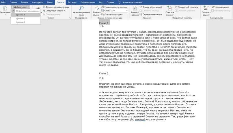 Итак, чтобы сделать содержание, нужно сначала собрать заголовки и подзаголовки. Выделяете заголовок, идете во вкладку «Ссылки», там находите раздел «Добавить текст». «Уровень 1» — заголовки глав, «уровень 2» — подзаголовки. После того, как обозначали уровень для каждого заголовка, ставите курсор на область, в которой хотите разместить содержание, снова заходите в «Ссылки» и нажимаете на «Оглавление». Всё! Аккуратное оглавление готово.