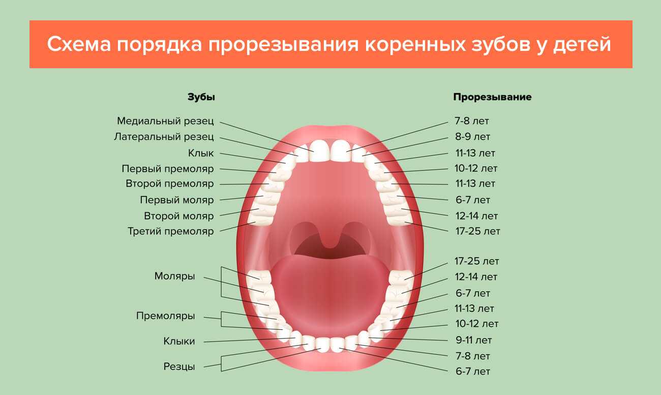 Первые постоянные зубки появляются за несколько месяцев до выпадения молочных — прорезываются моляры, они же «шестерки». Это происходит в возрасте шести лет. К восьми-девяти годам наступает очередь резцов. Когда ребенку исполняется десять-двенадцать лет, прорезываются премоляры и клыки. Следом идут вторые моляры, прорезывание коренных зубов завершается к совершеннолетию.