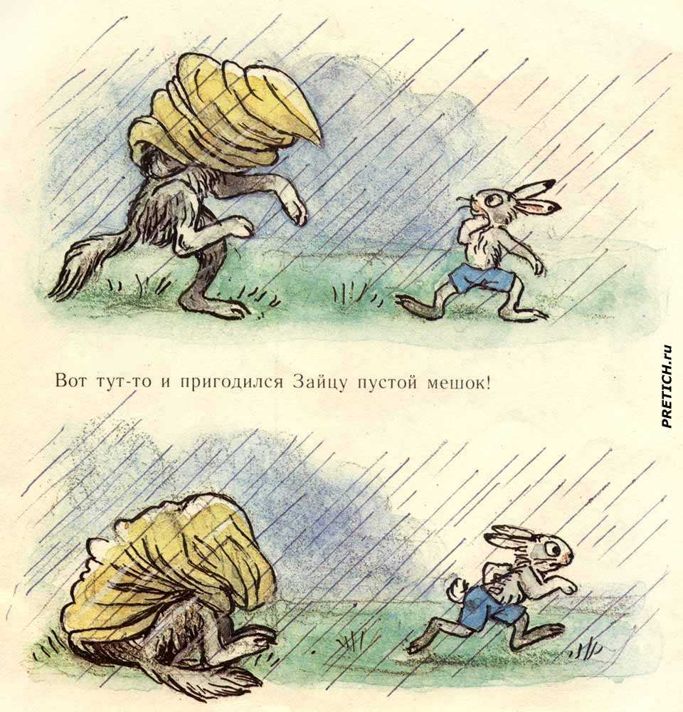 Вот тут-то и пригодился зайцу пустой мешок! Накинул его Заяц Волку на голову и наутёк пустился.