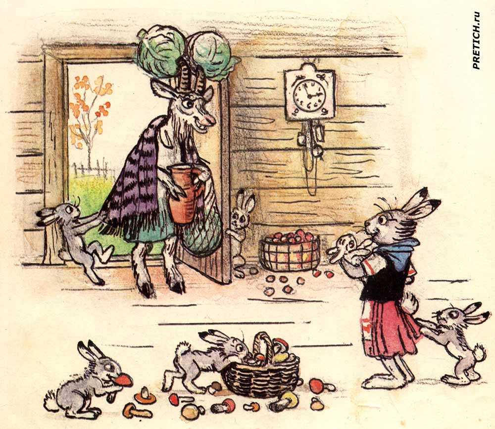 Вышел Заяц на лужок, а там Коза со своими козлятами гуляет. Их Заяц тоже яблоками оделил.