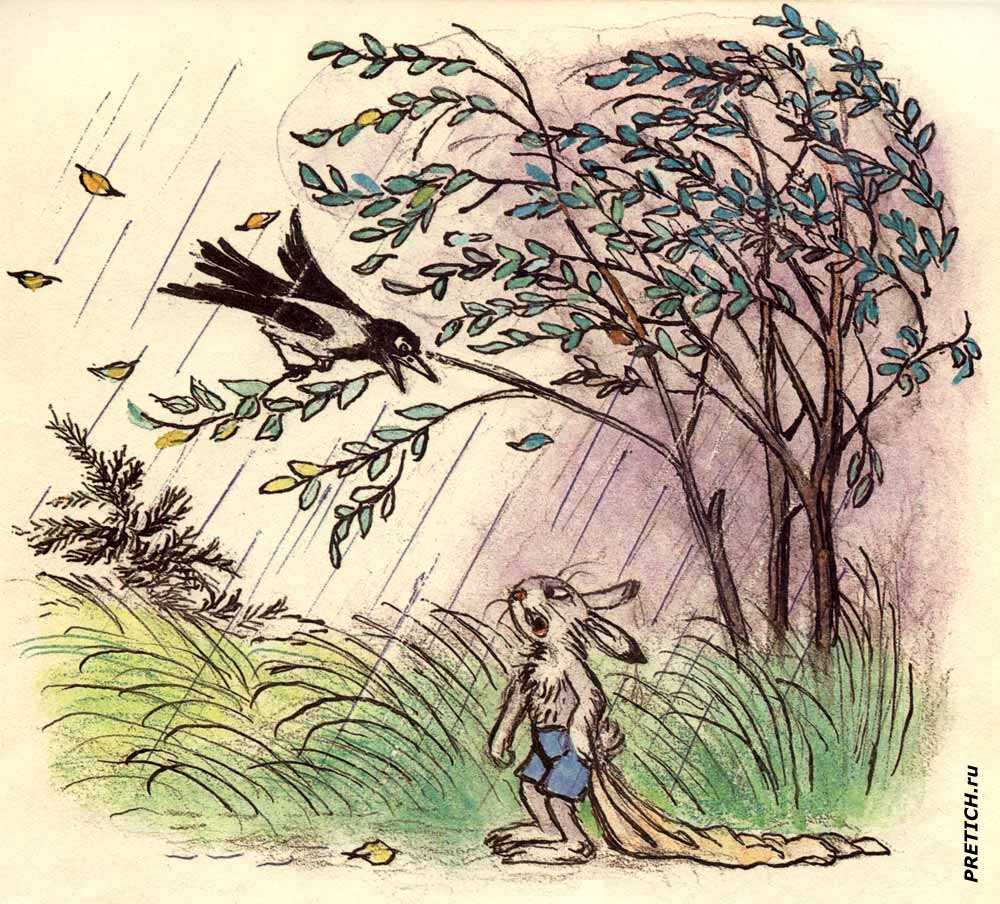 | Так заяц не заметил, как раздал все яблоки. Ворона сопровождала его и обиделась, что он об ней забыл. Кинулся заяц назад к яблоне, а под ней сидит волк! Кинулся волк на зайца, а тот ему на голову мешок из-под яблок накинул и побежал! | |