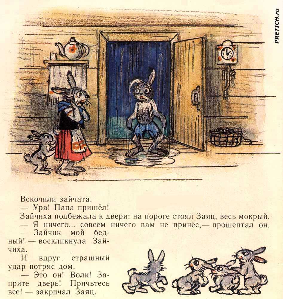 Зайчиха подбежала к двери: на пороге стоял Заяц, весь мокрый.