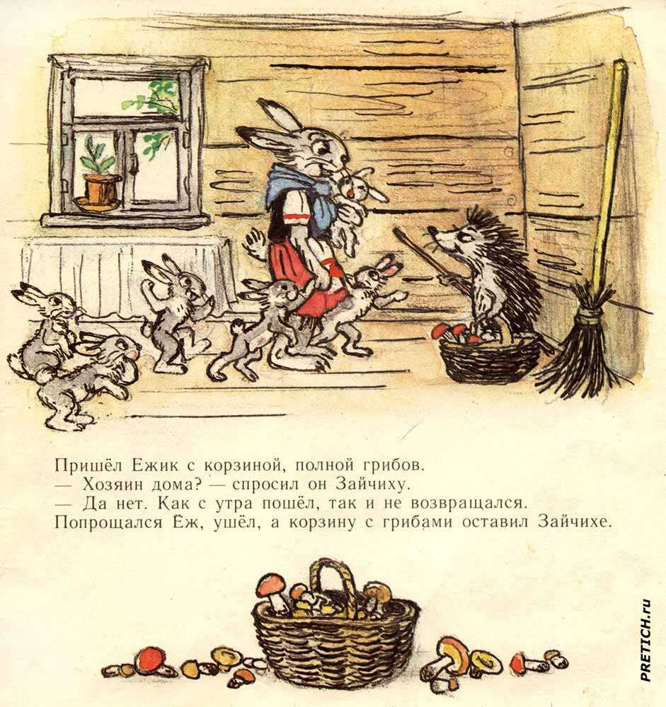 Попрощался Ёж, ушёл, а корзину с грибами оставил Зайчихе.