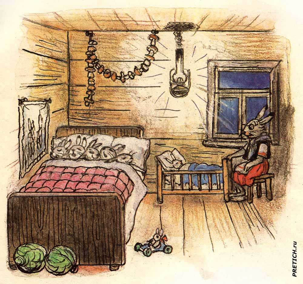 А дома давно крепким сном спали сытые зайчата. Только одна Зайчиха не спала: тихо плакала в своём уголке.