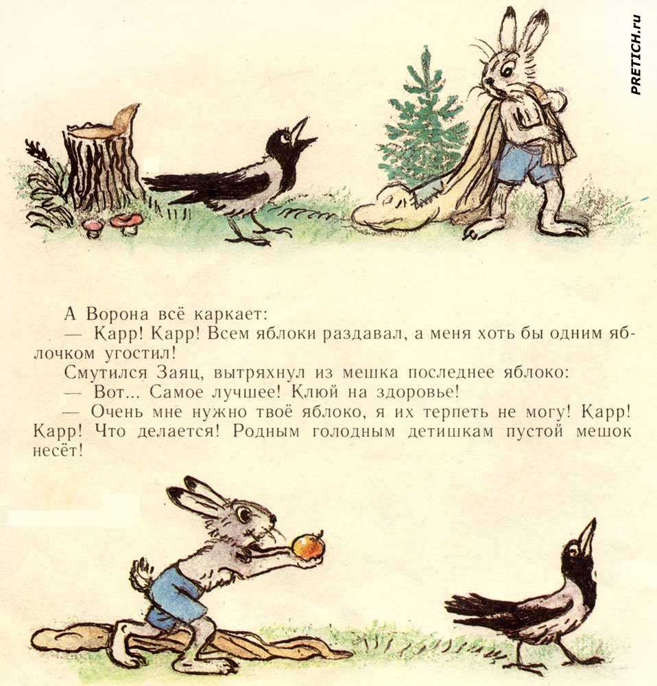 — Напрасно каркаешь, — говорит Заяц, — здесь яблок на весь лес хватит. А у меня зайчата дома голодные сидят.