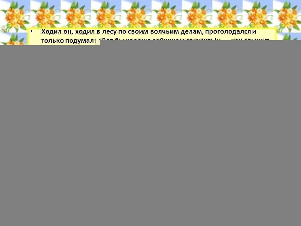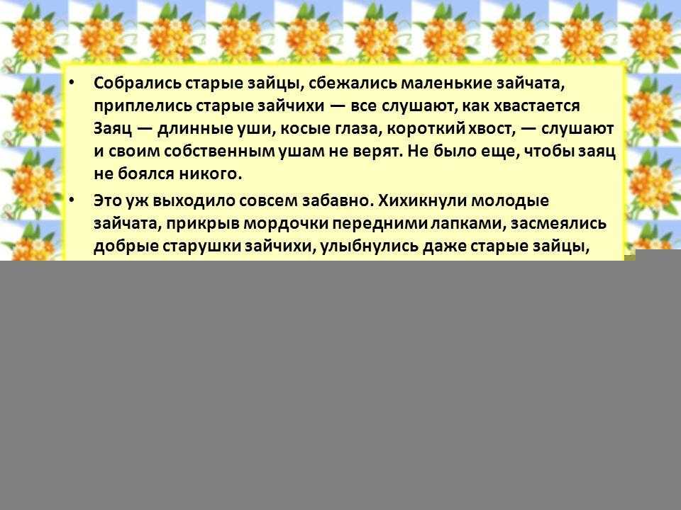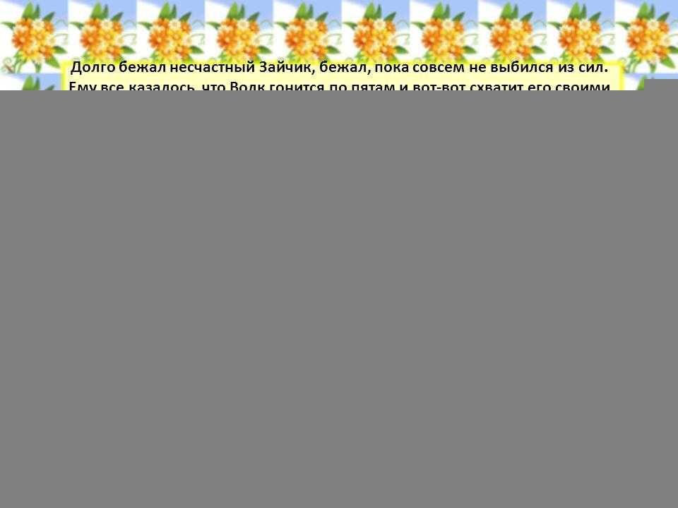 Ходил он, ходил в лесу по своим волчьим делам, проголодался и только подумал: «Вот бы хорошо зайчиком закусить!» как слышит, что где-то совсем близко зайцы кричат и его, серого Волка, поминают. Сейчас он остановился, понюхал воздух и начал подкрадываться. Совсем близко подошел волк к разыгравшимся зайцам, слышит, как они над ним смеются, а всех больше хвастун Заяц косые глаза, длинные уши, короткий хвост. «Э, брат, погоди, вот тебя-то я и съем!» подумал серый Волк и начал выглядывать, который заяц хвастается своей храбростью. А зайцы ничего не видят и веселятся пуще прежнего. Кончилось тем, что хвастун Заяц взобрался на пенек, уселся на задние лапки и заговорил: Слушайте вы, трусы! Слушайте и смотрите на меня! Вот я сейчас покажу вам одну штуку. Я… я… я… Тут язык у хвастуна точно примерз. Заяц увидел глядевшего на него Волка. Другие не видели, а он видел и не смел дохнуть. Дальше случилась совсем необыкновенная вещь.