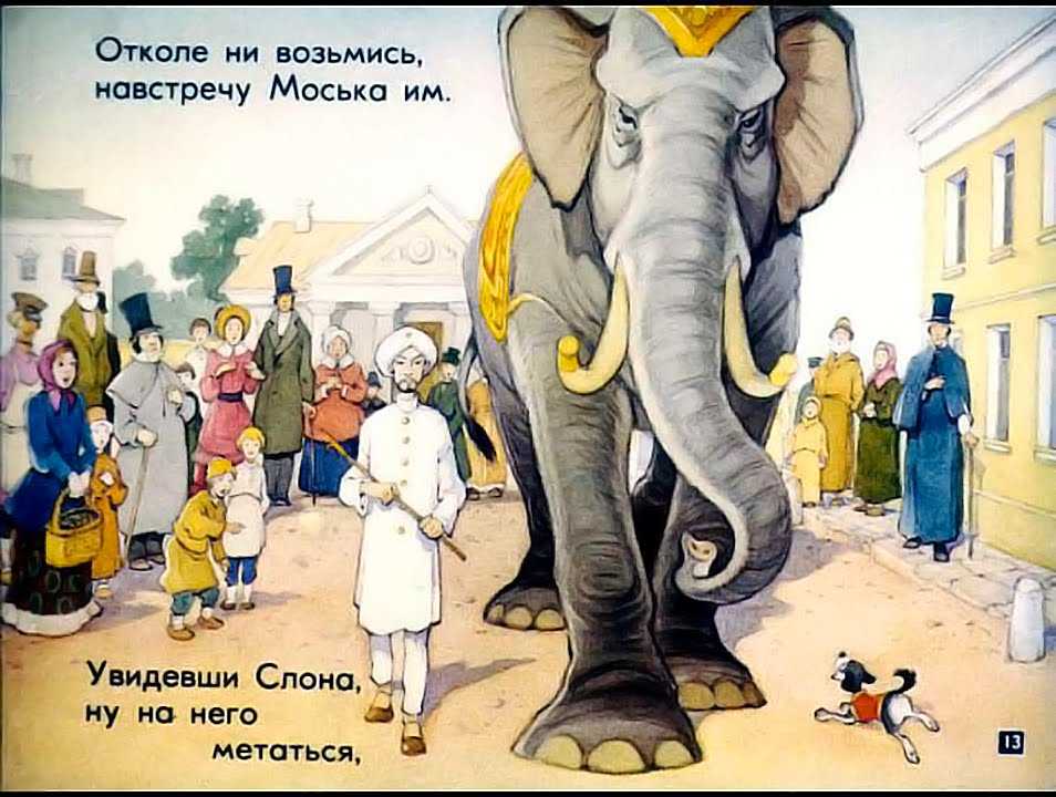 В басне Ивана Андреевича Крылова «Слон и Моська» повествуется о слоне, которого вывели на улицы города для развлечения жителей, и о Моське, маленькой дворовой собачке. На вполне себе мирно шествующего слона внезапно начинает лаять, визжать, скулить Моська.