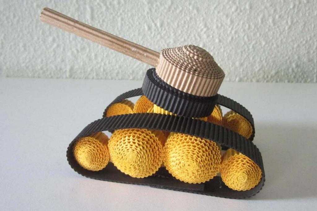 Прекрасной поделкой военной техники в детский сад будет сделанный из плотной гофрированной бумаги танк. Если вы знакомы с техникой квиллинга, то легко справитесь с таким несложным заданием. Начинающих мастеров можно успокоить, все у них получится тоже с первого раза. Берем любые три цвета волнистой бумаги, можно использовать данные на образце ниже, интересно подобрать цвета военного танка — зеленый, болотный, песочный. Гусеницы машины в любом случае делают черного цвета.