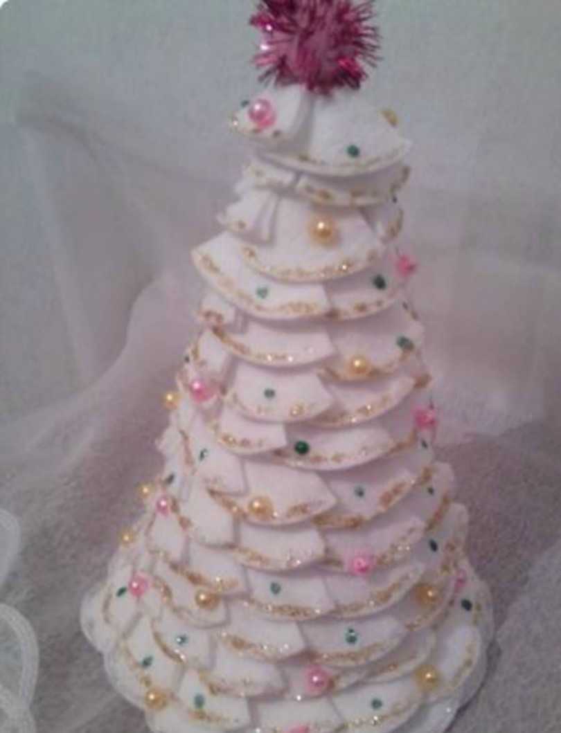 Клеим заготовки веток, начиная снизу. На каждую четвертинку диска наносим клей на уголок. Крепим ее снизу, по очереди друг за другом внахлест. Приладив первый ряд, наносим второй таким образом, чтобы немного накрыть нижний. И так продолжаем отделку до макушки конуса. Украшаем, как подскажет фантазия. Но помним: не стоит забивать мишурой оригинальную прелесть ватных рукоделок.