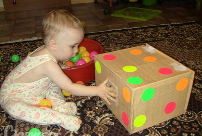 - большая коробка с прорезанными отверстиями, по форме подходящими под большие, средние, маленькие мячики и кубики;