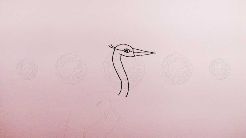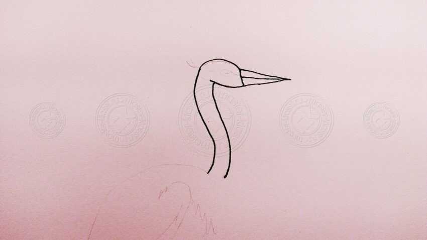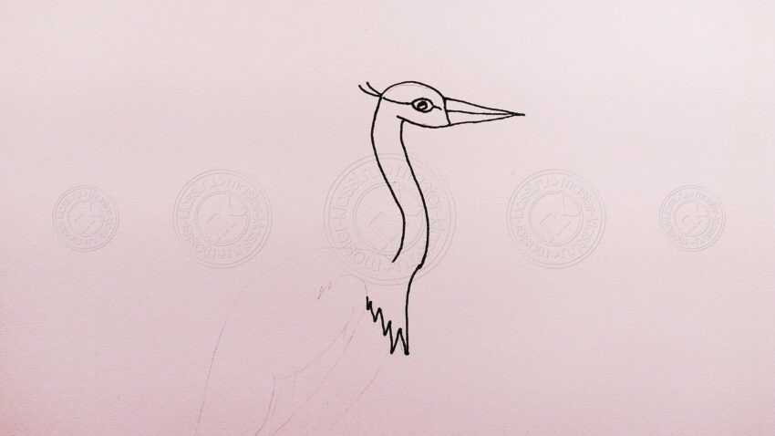 Рисуется форма головы, после изображается клюв и глаз. При этом контуры журавля наносятся на вертикально расположенный лист, а отображение птицы происходит с бокового вида. Рисуется длинная шея путем проведения двух линий от головы. Линии должны быть непрерывными и неровными. От нижней части шеи изображается набросок овального туловища. На бумагу наносятся наброски лап