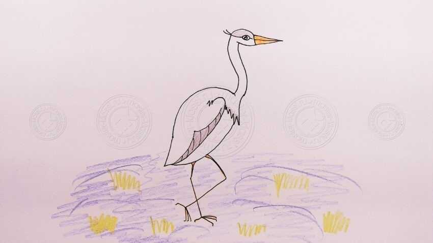 - Завершают эскиз, прорисовывая лапы журавлю. Он может в этот момент стоять в водоеме или на болотной кочке. Здесь можно проявить фантазию. Разукрашивают птицу на свое усмотрение, выделив линии эскиза фломастером. Рисунок выполнен!