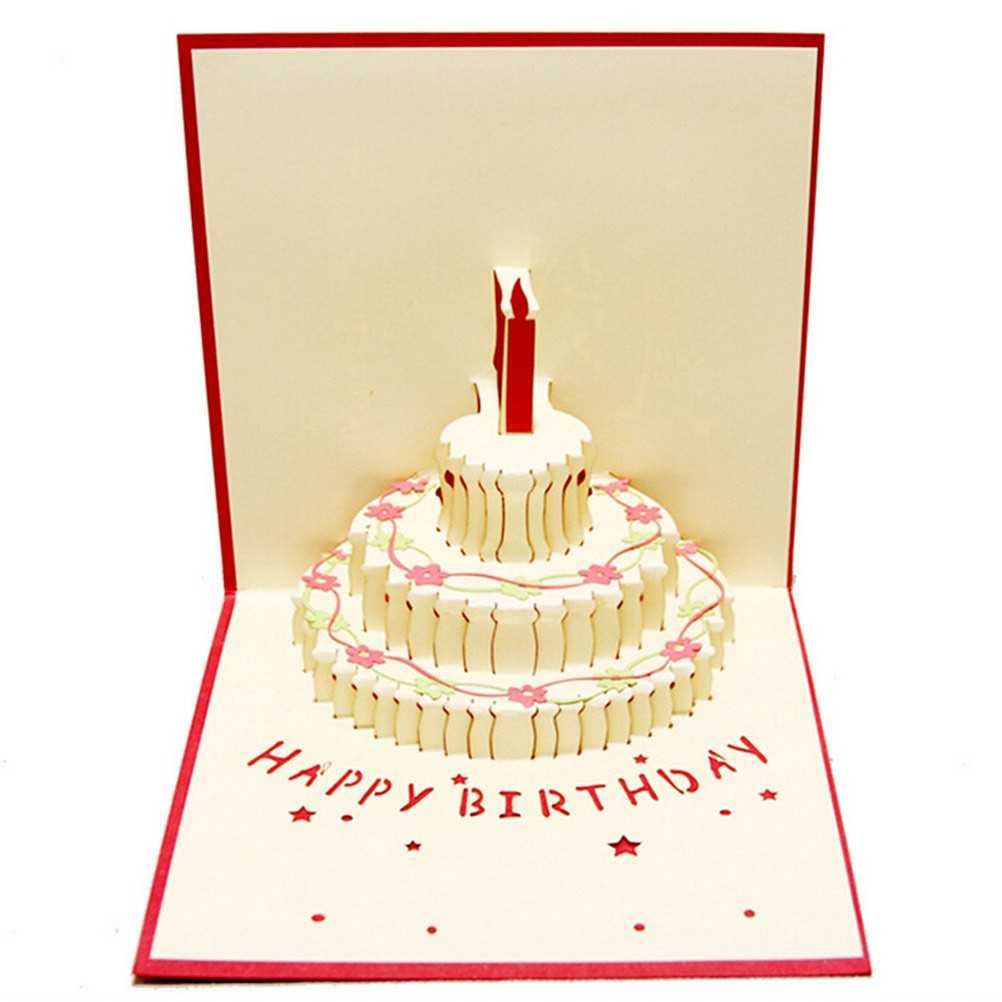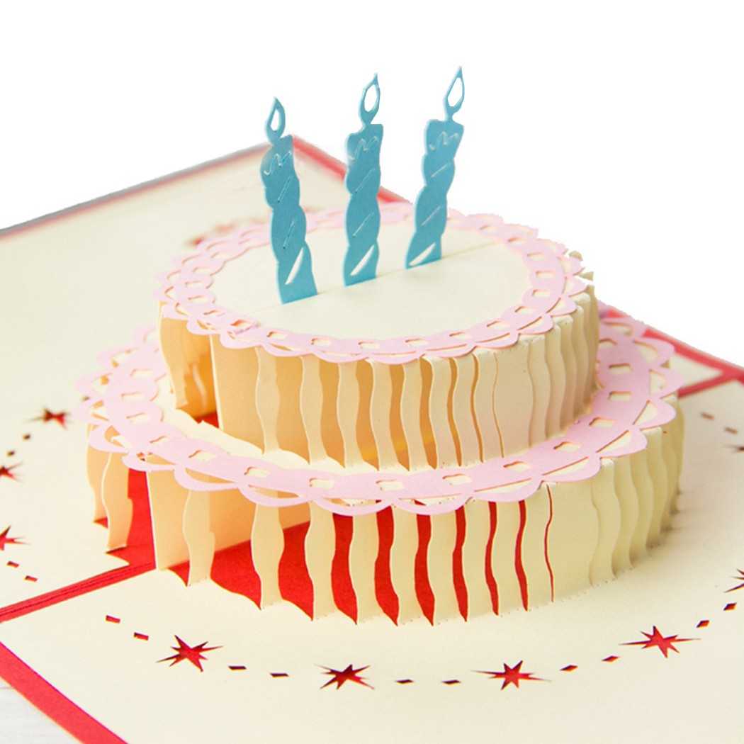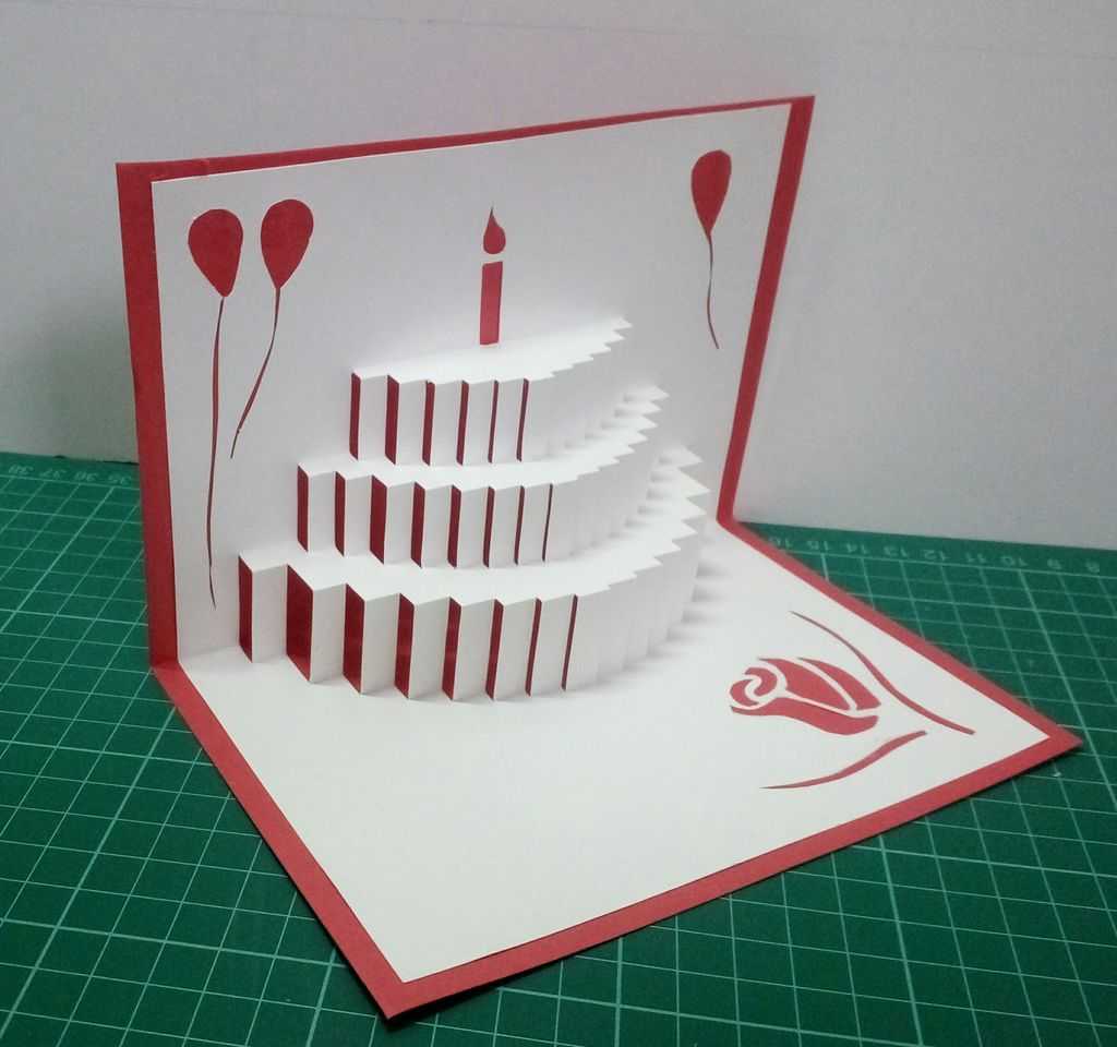 Начинать лучше с простой объемной открытки своими руками на день рождения. Например, с использованием плотной бумаги двух контрастных цветов можно сделать открытку-тортик имениннику: