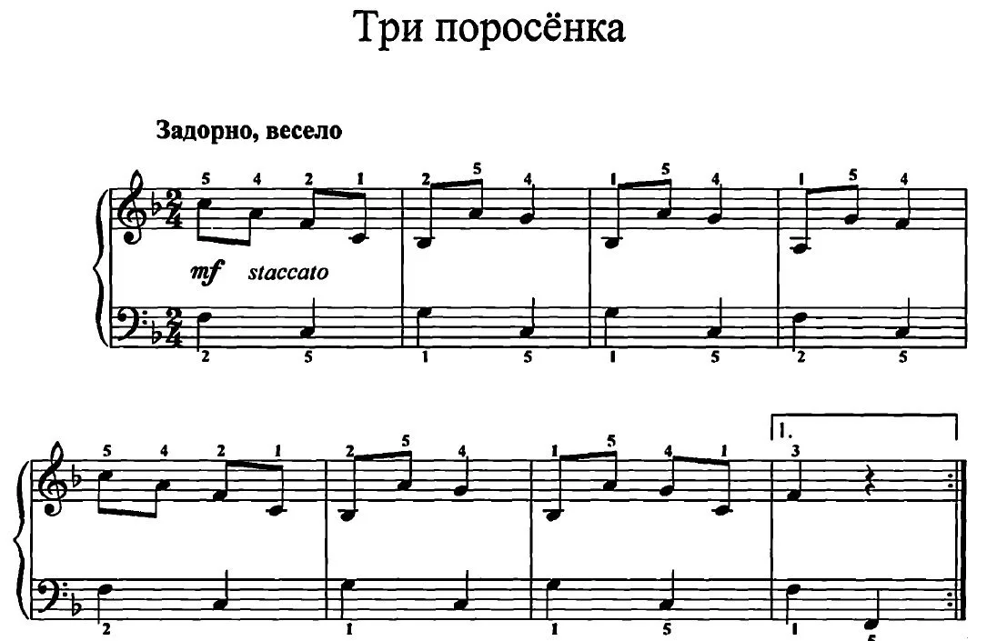 Мелодия написанная Френком Черчиллем должна исполняться весело и задорно. Очень часто используется прием Staccato, это значит, что пальцы должны отскакивать от клавиш фортепиано. Хорошая практика для отработки этой техники для начинающих.