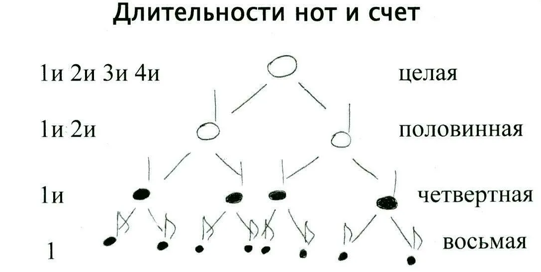 - Четвертная нота: черный круг с палочкой, 1/4 целой. Считается: 1и.