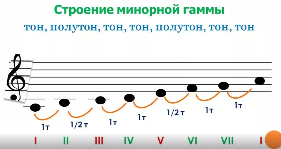 Минорный лад строится в следующем порядке: тон-полутон-тон-тон-полутон-тон-тон.