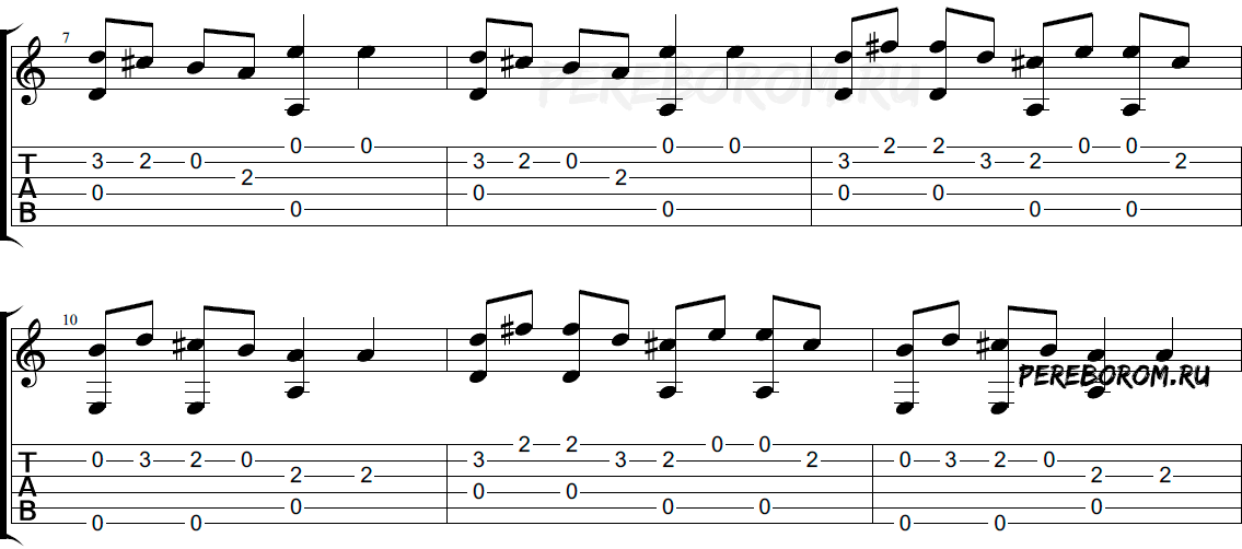 Играем щипком одновременно открытую четвёртую струну (большим правой руки) и вторую (пальцем «a» правой) – 3-2 безым. — сред. (левой) и на 2 третьей переходим средней. Когда играется несколько нот на одной струне (как в этом случае – на 2-ой) – чередуем a-m-a. Не забудьте приглушить бас ре (откр. 4) через четверть, чтобы избежать наслоения открытых 4 и 5.