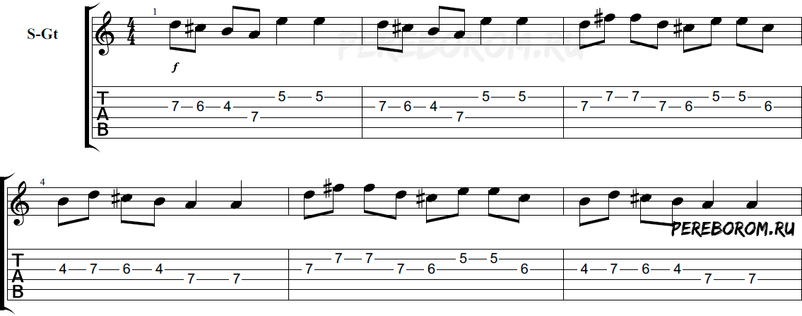 Если неудобно мизинцем, то можно начать с без-ого: тогда идёт порядок безым-сред-указ., а на 5 лад переходим указ-ым. 7 (и 6) лад на 3-ей играем средним, а 7 на 2 – безым-ым. 5 на втором – указ-ым. На третьей струне 4 – указательный, 7 – мизинец, 6 – безымянный.