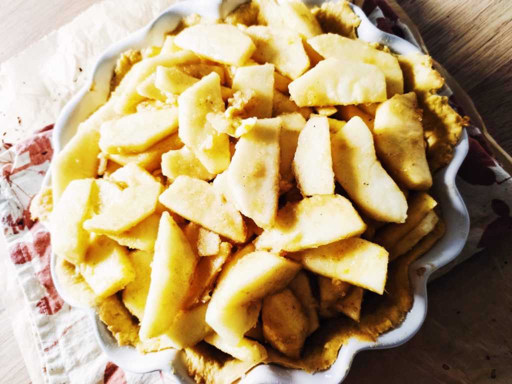 - Нарезать очищенные яблоки. Плотно уложить в тесто по всей поверхности.