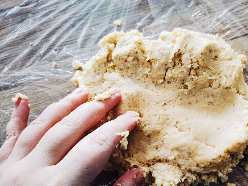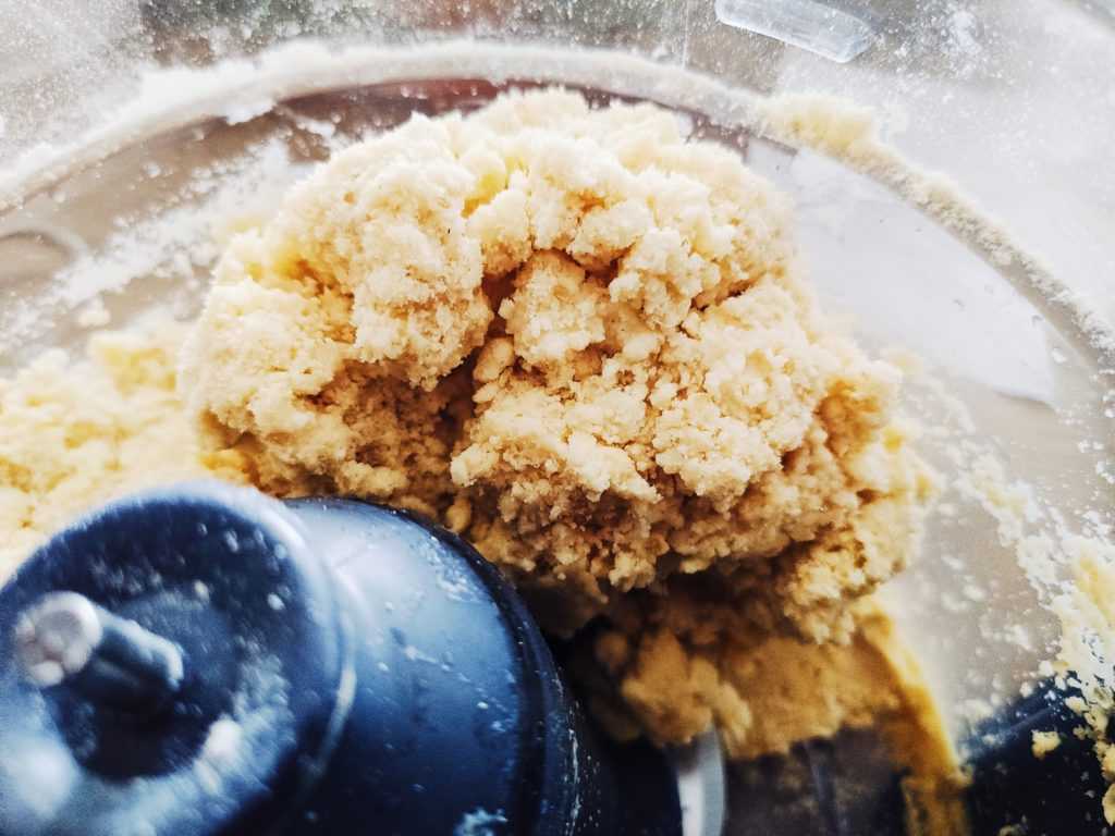 Как-то так выглядит песочное тесто, которому больше не надо воды. Если вы промахнулись и перелили воду, можно быстро-быстро вмешать немного муки. Но лучше не промахиваться.