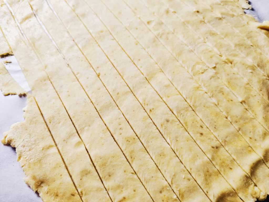Раскатать большую часть отдохнувшего теста. Оно должно легко отходить от коврика или пергамента, на котором вы его раскатываете, и держать форму. Толщина раскатанного теста должна быть 2-3 миллиметра.