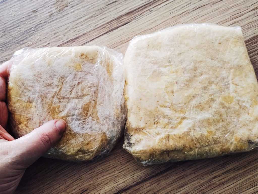 Готовое тесто разделить на две неравные части – примерно 2/3 и 1/3, замотать в пленку и убрать в холодильник хотя бы на 2 часа.