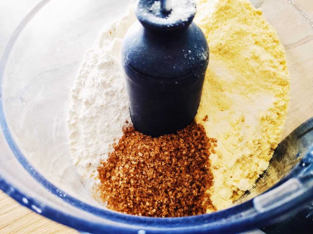 Пшеничную и кукурузную муку вместе с сахаром, солью и тертым чеддаром сложить в чашу кухонного процессора, добавить туда масло кусочками. Теперь короткими импульсами измельчить и смешать масло с сухими ингредиентами в процессоре. Короткие импульсы помогают не перегреть масло. Если у вас нет кухонного процессора, сделайте это в планетарном миксере или вовсе сделайте это руками.