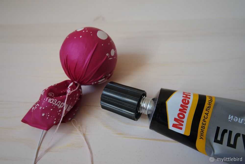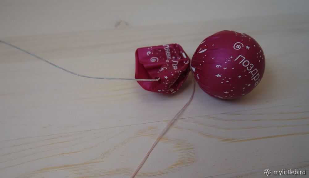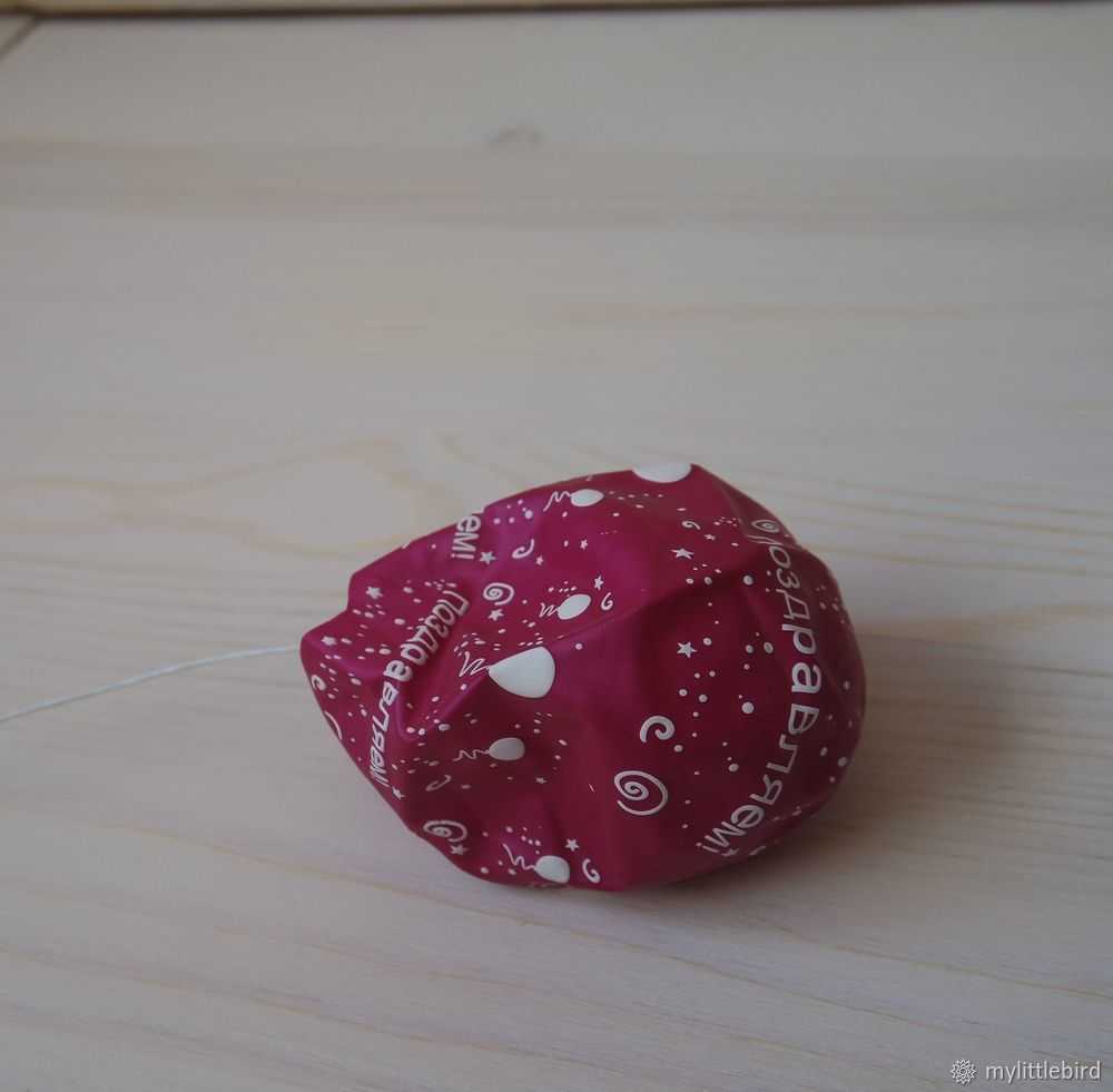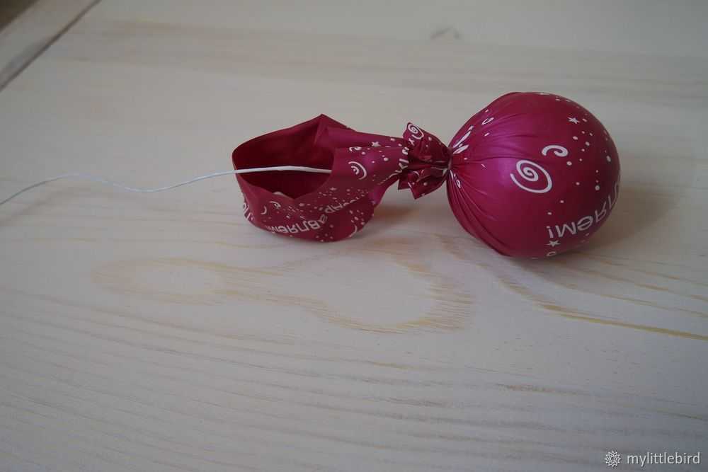 Теперь самое интересное:) Если вы взяли шарик с рисунком то на этом этапе как раз нужно выбрать как будет располагаться рисунок. Сверху, или сбоку, или у вас будет 2 рисунка с двух сторон. Выбираем подтягивая резиновый шар на нашу заготовку. И когда определитесь и вам все понравиться, берем ниточку и, обмотав несколько раз внизу нашего шарика- завязываем крепкий узелок. Аккуратно, чтоб нитка не порвалась.