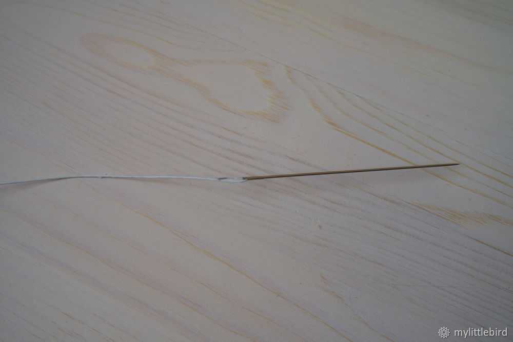 Для прочности я аккуратненько по нитке прохожу клеем Момент. Наношу небольшое количество на иголочку и небольшими капельками прохожу по всей нитке. Потом края ники обрезаем.