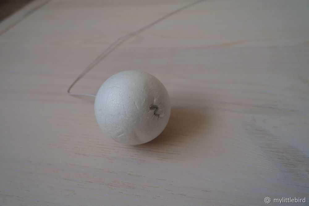 Одеваем шарик на пенопласт, таким образом, чтобы то что мы намотали из проволоки оказалось наверху нашего будущего шара: