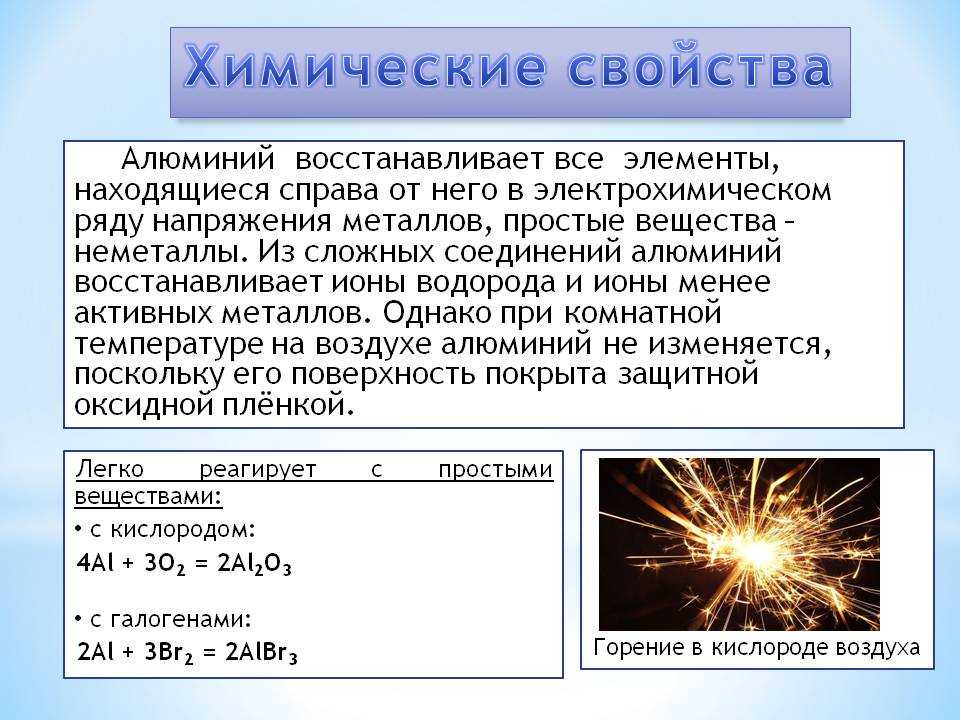При нормальных условиях алюминий покрыт тонкой и прочной оксидной плёнкой и потому не реагирует с классическими окислителями: с H2O, O2, HNO3 (без нагревания), H2SO4, но реагирует с HCl. Благодаря этому алюминий практически не подвержен коррозии и потому широко востребован современной промышленностью. Однако при разрушении оксидной плёнки (например, при контакте с растворами солей аммония NH+, горячими щелочами или в результате амальгамирования), алюминий выступает как активный металл-восстановитель. Не допустить образования оксидной плёнки можно, добавляя к алюминию такие металлы, как галлий, индий или олово. При этом поверхность алюминия смачивают легкоплавкие эвтектики на основе этих металлов.