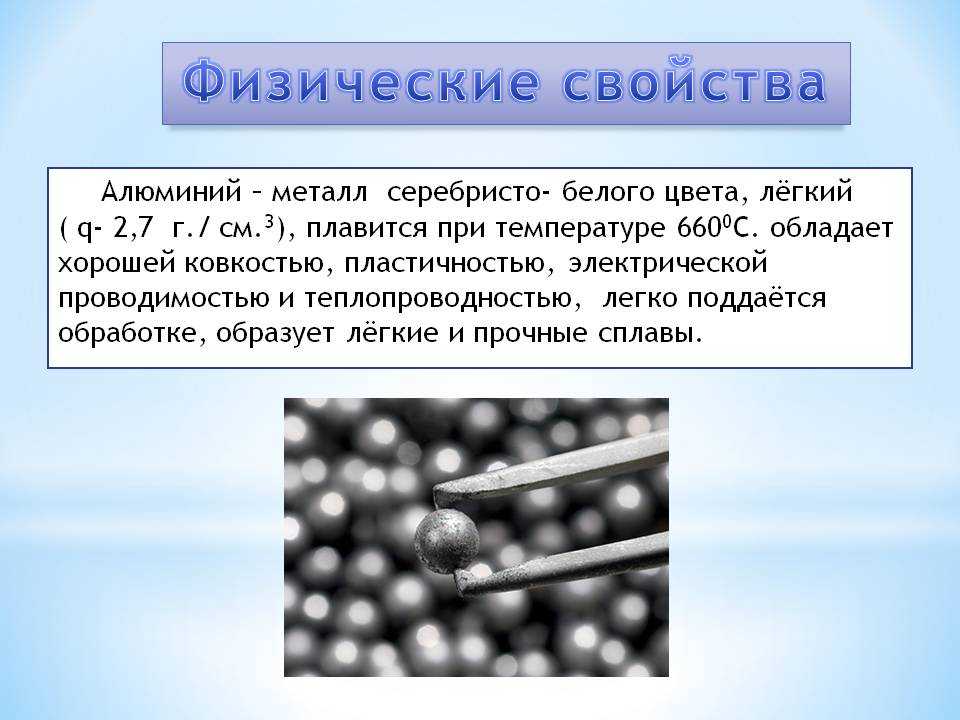 Микроструктура алюминия на протравленной поверхности слитка, чистотой 99,9998 %, размер видимого сектора около 55×37 ммМеталл серебристо-белого цвета, лёгкийплотность — 2712 кг/м³температура плавления у технического алюминия — 658 °C, у алюминия высокой чистоты — 660 °Cудельная теплота плавления — 390 кДж/кгтемпература кипения — 2500 °Cудельная теплота испарения — 10,53 МДж/кгудельная теплоёмкость — 897 Дж/кг·Kвременное сопротивление литого алюминия — 10—12 кг/мм², деформируемого — 18—25 кг/мм², сплавов — 38—42 кг/мм²Твёрдость по Бринеллю — 24…32 кгс/мм²высокая пластичность: у технического — 35 %, у чистого — 50 %, прокатывается в тонкий лист и даже фольгуМодуль Юнга — 70 ГПаАлюминий обладает высокой электропроводностью (37·106 См/м) и теплопроводностью (203,5 Вт/(м·К)), 65 % от электропроводности меди, обладает высокой светоотражательной способностью.Слабый парамагнетик.Температурный коэффициент линейного расширения 24,58·10−6 К−1 (20…200 °C).Удельное сопротивление 0,0262..0,0295 Ом·мм²/мТемпературный коэффициент электрического сопротивления 4,3·10−3 K−1. Алюминий переходит в сверхпроводящее состояние при температуре 1,2 кельвина.Алюминий образует сплавы почти со всеми металлами. Наиболее известны сплавы с медью и магнием (дюралюминий) и кремнием (силумин).