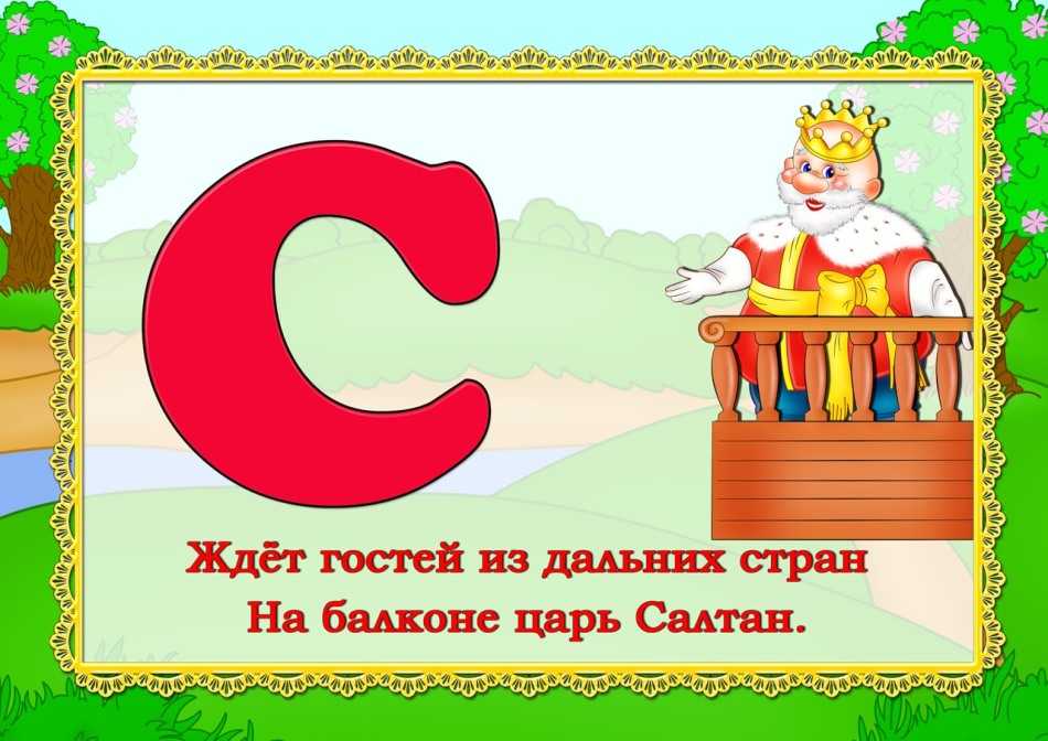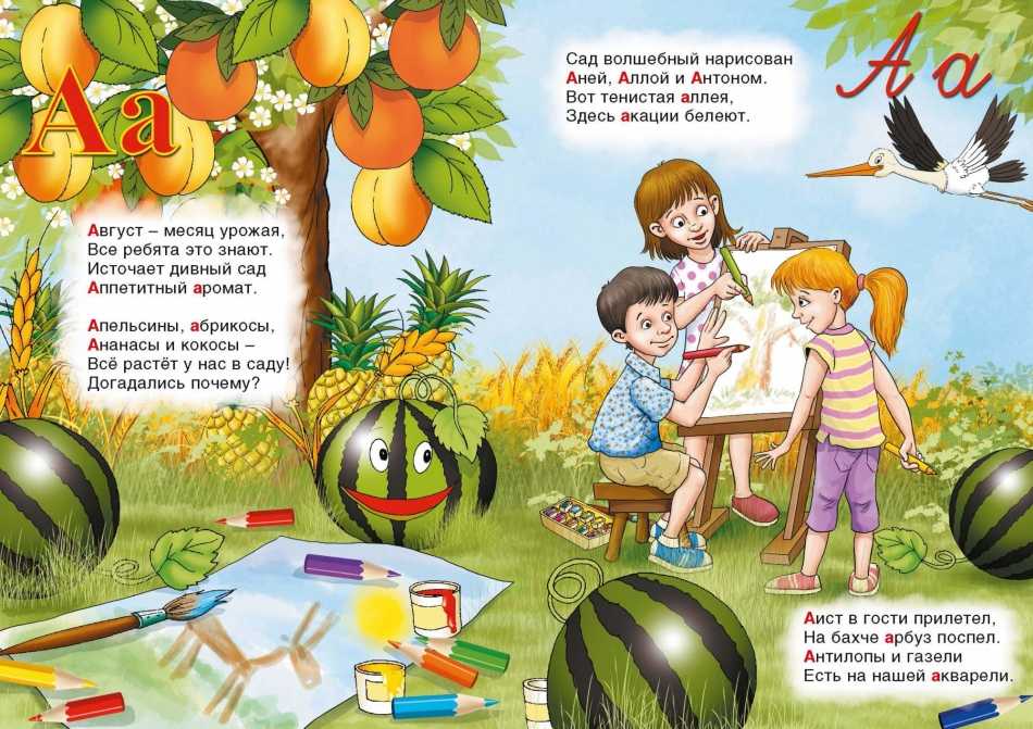 А — зубастая акула! Б – вот бабочка вспорхнула, В – волчонок выл от скуки, Г – взял гном гитару в руки, Д – дорога к дому вьется, Е – под елью гриб найдется, Ё – обрадовался ежик! Ж – журавль без сапожек, З – забыл зайчишка книжку, И – индюк, надутый слишком, Й — фруктовый йогурт сладкий, К — кот ел его украдкой. Л – лягушка любит воду, М – медведь наелся меду, Н – был носорог сердитым, О — окно держи открытым, П – посуду мыла Поля, Р – растут ромашки в поле, С – сияет солнце ярко, Т – а тигру в клетке жарко! У— растет укроп на грядке, Ф – играет филин в прятки, Х — от хлебушка горбушка, Ц – цыплята у старушки, Ч – мы чай налили Любе, Ш – зимою ходим в шубе, Щ — щенок нас ждет у дома Ъ – подъезд знакомый, Ы – так много дырок в сыре! Ь – нет мягче в мире! Э – экран в ночи мерцает Ю – юнгой стать малыш мечтает Я – якорь в море будет брошен, Все запомнил, мой хороший?