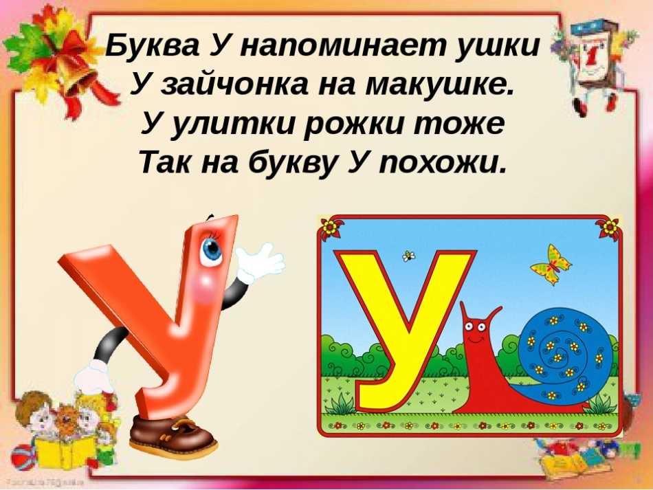 Ульяна учила алфавит, Буква У, она гудит, Уж, улитка, уголок, Букву У я знаю на зубок.