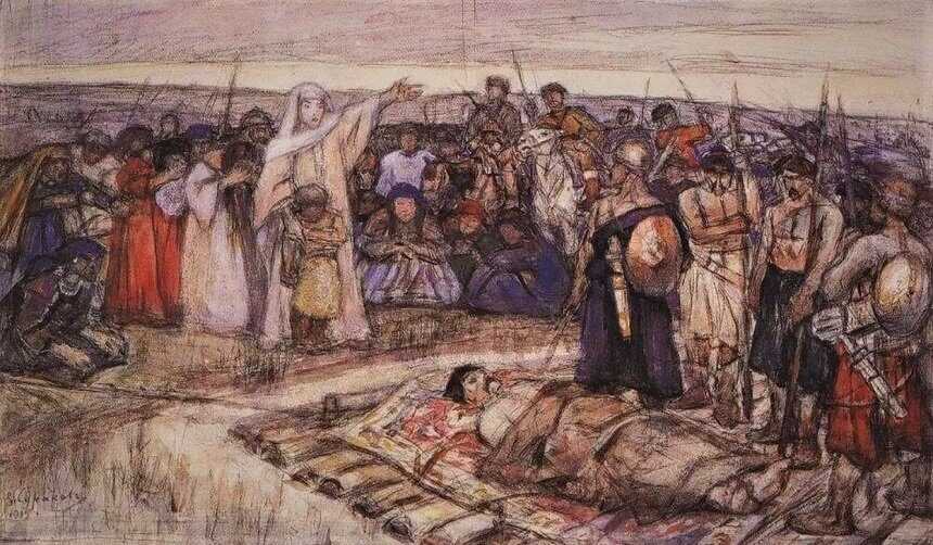 Княгиня Ольга встречает тело князя Игоря, убитого древлянами. Картина Сурикова