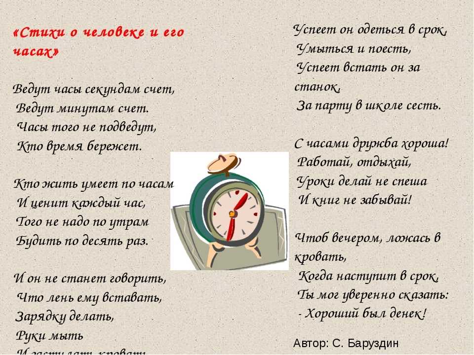 Пробегут часы, минутки Соберутся вместе в сутки. В них двадцать четыре часа, И стрелки творят чудеса. Стрелка первый круг проходит, — Полдень в гости к нам приходит, А она спешит опять Час за часом отмечать. Стрелка круг второй прошла, — В гости полночь к нам пришла, День прошел, прошла и ночь, — Убежали сутки прочь.