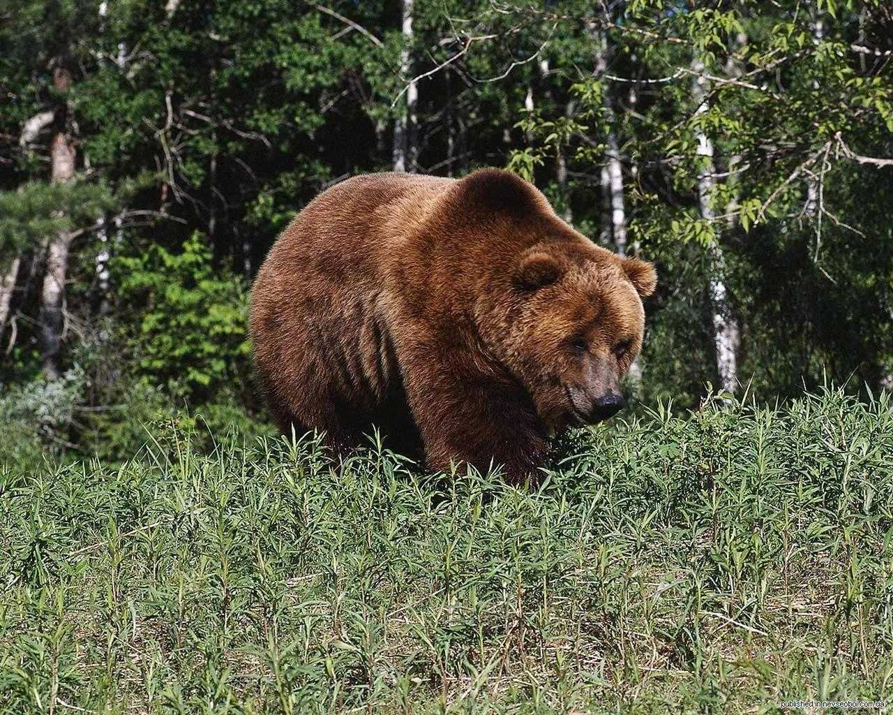 Бурого медведя еще называют медведем обыкновенным. Достаточно опасный хищник, который не против полакомиться ягодами или другими сладостями. Вырастает в высоту почти до 3-х метров, прекрасно лазит по деревьям и ворует у пчел мед. Любит так же рыбу.