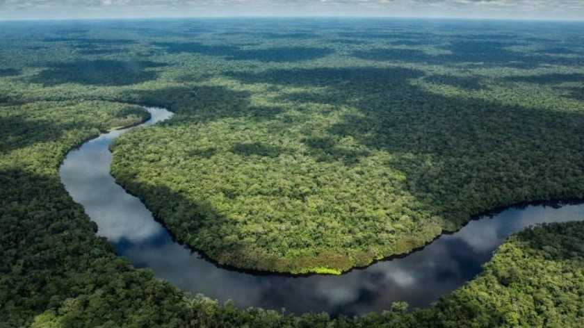 Среднее лесное дерево каждый день выбрасывает в атмосферу 1000 литров водяного пара (220 имп галлонов; 264 галлона США). Было обнаружено, что в то время как каждый квадратный метр поверхности моря испаряет один литр воды каждый день, та же площадь леса испаряется примерно в восемь раз больше из-за нескольких слоев листвы в Корона деревьев. Основной поток воздуха в бассейне Амазонки направлен на юго-запад. Когда эта воздушная масса достигает Анд, горный хребет действует как «естественный барьер», перенаправляя огромные объемы влажного воздуха в центральную и южную часть Бразилии, а также в северную Аргентину, Парагвай и Уругвай, и в этих областях выпадают дожди. Какая-то часть этого воздуха успевает преодолеть Кордильеры и осадки дождя в Перу. Другие воздушные массы движутся на север из бассейна Амазонки, проходя над Колумбией, Венесуэлой, Гайаной, Французской Гвианой и Суринамом.
