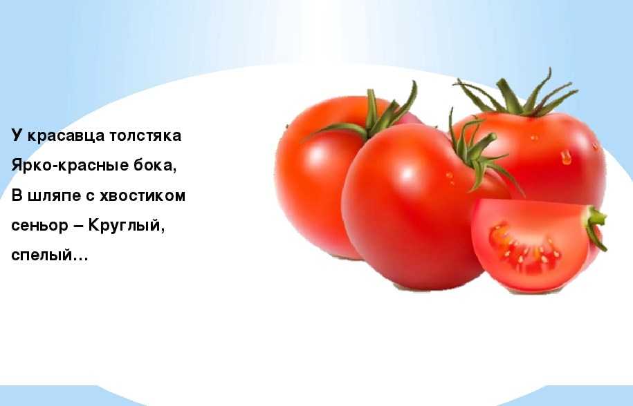 - Как на нашей грядке выросли загадки. Сочные да крупные, вот такие круглые. Летом зеленеют, к осени краснеют. (Ответ — помидоры.)