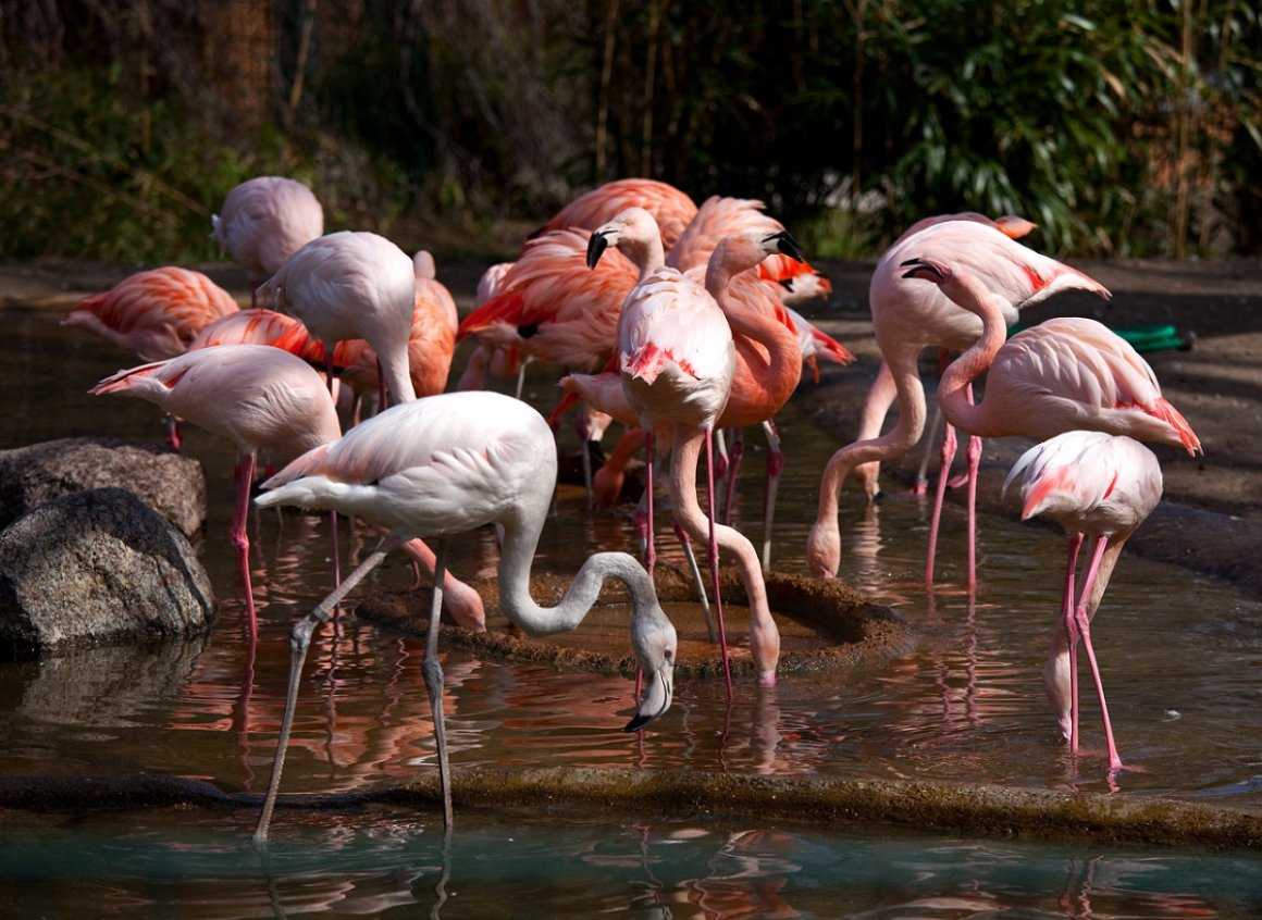 В зоопарках фламинго не теряют своей уникальной окраски, так как им в рацион добавляют продукты с каротином: морковь и сладкий перец, ну и конечно же, мелких ракообразных. За счет чего фламинго выглядит таким же ярким, как и в дикой природе.