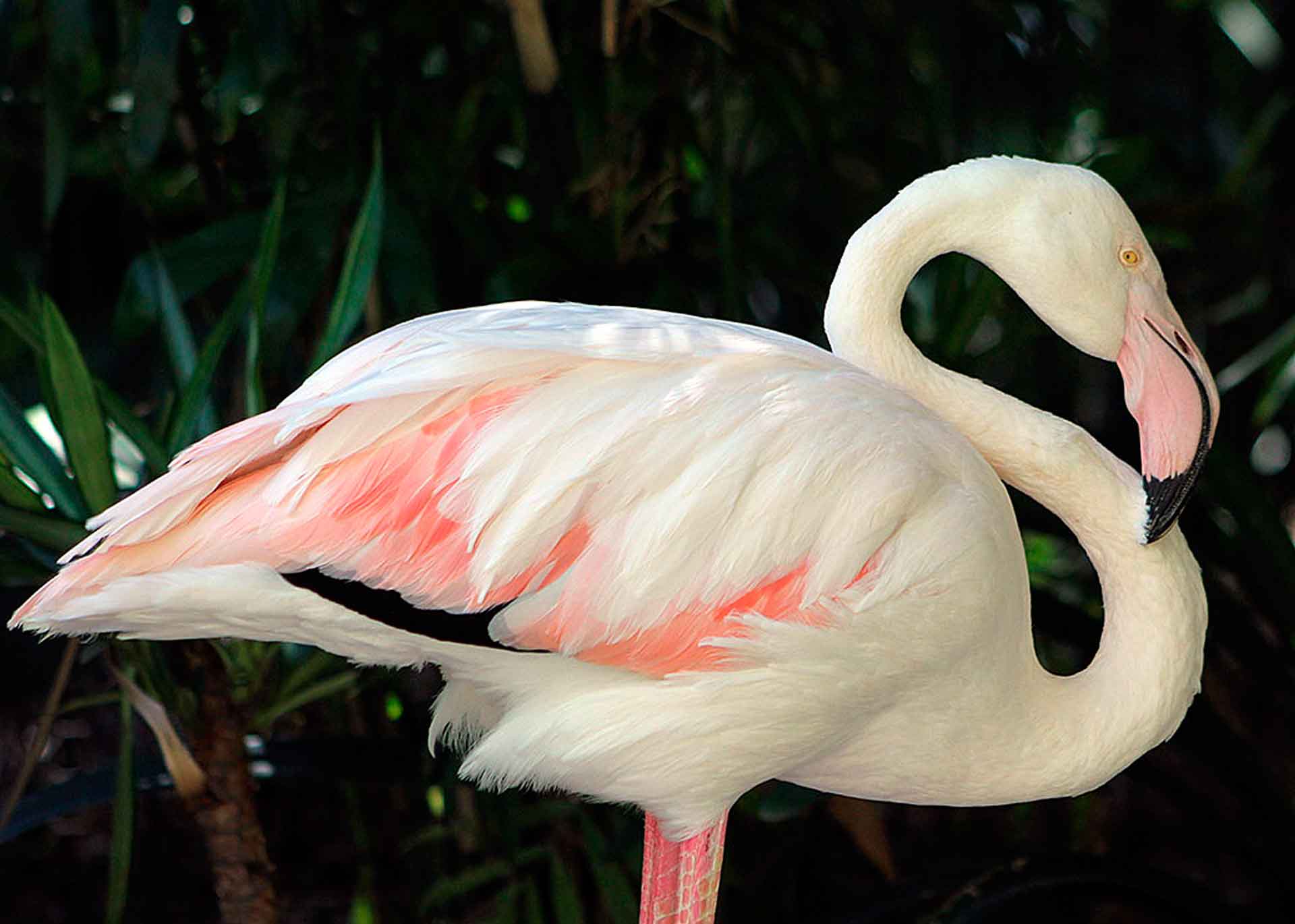 Фламинго выглядит необычно не только благодаря уникальной раскраске своего оперения. Птица фламинго с завидной грацией держит свою длинную шею в виде знака вопроса. Также фламинго с легкостью стоят на одной ноге. Для сокращения потери тепла они по очереди держат ноги в своем оперении. Со стороны такая поза кажется весьма трудной и неудобной. Но на деле абсолютно не требует никаких усилий от фламинго.
