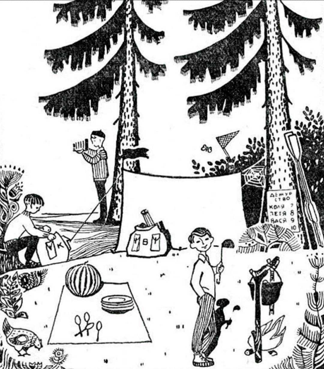 - Коля. Он копается в рюкзаке с буквой «К», Вася что-то фотографирует (в рюкзаке с буквой «В» виден штатив), Шура ловит бабочек, а значит, сегодня дежурит Петя. А вчера Коля (смотрим на график дежурств).