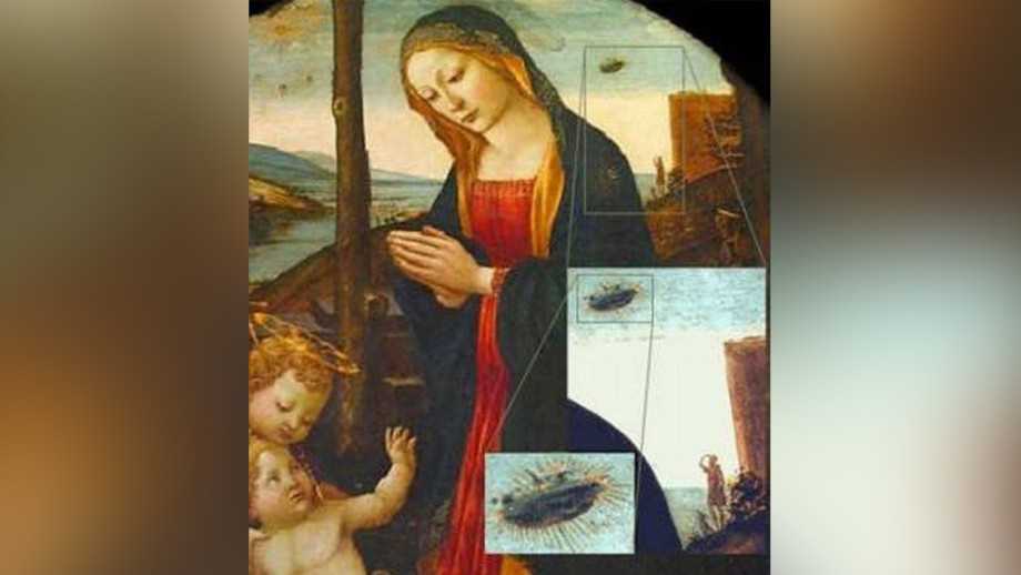 «Джоконда» – не единственная картина, собравшая в себе множество засекреченных деталей. Наверное, вокруг каждого произведения искусства можно построить множество теорий и мифов. Так, например, одна из известнейших картин Доменико Гирландайо «Мадонна со святым Джованнино» несет в себе удивительную тайну. На первый взгляд, в полотне нет ничего примечательного, кроме, собственно, самой Мадонны, маленького Христа и святого Джованнино. Но посмотрите в правый верхний угол – что это? Многие утверждают, что на средневековой картине изображено не что иное, как летающая тарелка. Уфологи утверждают, что это прямое доказательство того, что инопланетяне существуют. Искусствоведы же полагают, что эти божественные шары света – символ, который часто встречается на религиозных картинах.