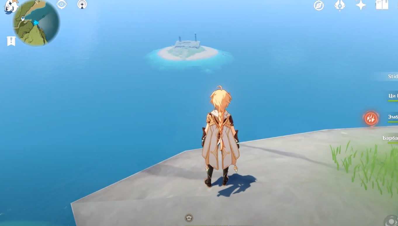 Есть и второй способ, который связан с персонажем Кэйа. Этот персонаж умеет замораживать поверхность. В том числе и водную. Создавая под собой ледяную дорожку, минут за десять вы проложите путь к острову. Желательно иметь в команде несколько героев с морозными заклинаниями — так вы ускорите свое путешествие.