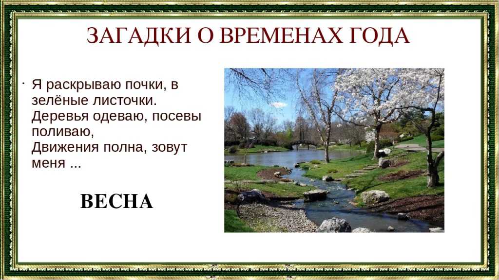 Времена года играют важную роль в жизни каждого человека, ведь от них зависит вид деятельности, качество жизни и привычки любого жителя Земли. Поэтому малыши обязательно должны знать различия между временами года и легко угадывать их в несложных задачках. Попробуйте загадать для начала наши несложные рифмованные головоломки и убедитесь, что ребята с восторгом и энтузиазмом воспримут их.