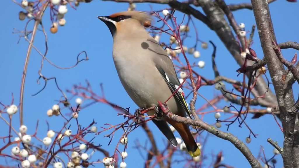 Зимой свиристель становится привычным обитателем населенных пунктов средней полосы России, интересно, что людей эти птицы не боятся и тогда их можно рассмотреть во всей красе. Что тянет свиристелей зимой поближе к людям? Только источник питания – растущие в садах и парках плодовые деревья, которые не теряют урожай с наступлением холодов, ведь рацион этих птиц сильно меняется в зависимости от времени года.