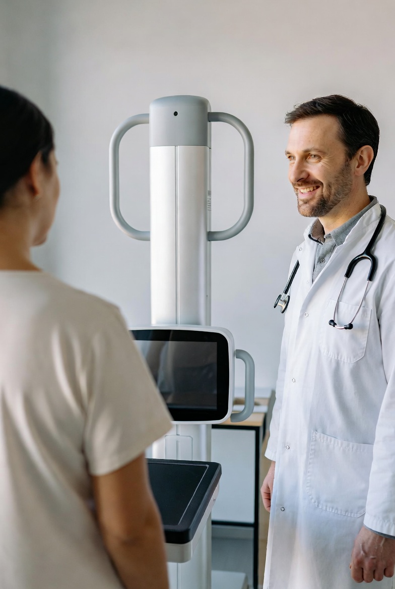 - Встаёте у специальной стойки и прижимаетесь грудью к экрану аппарата.