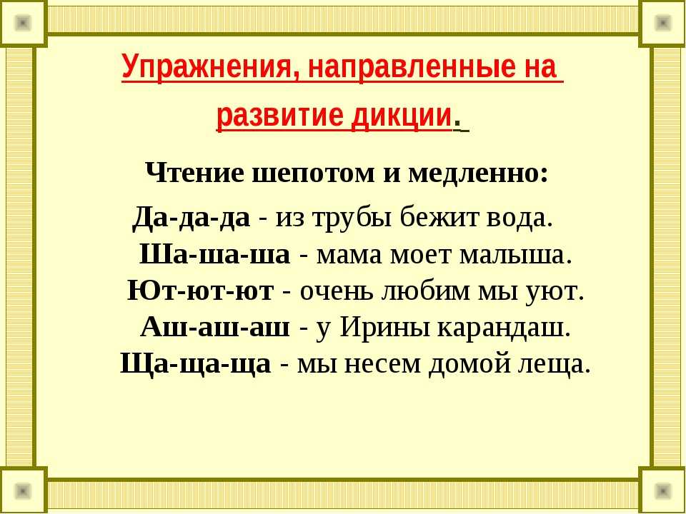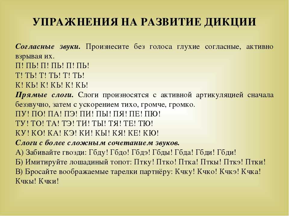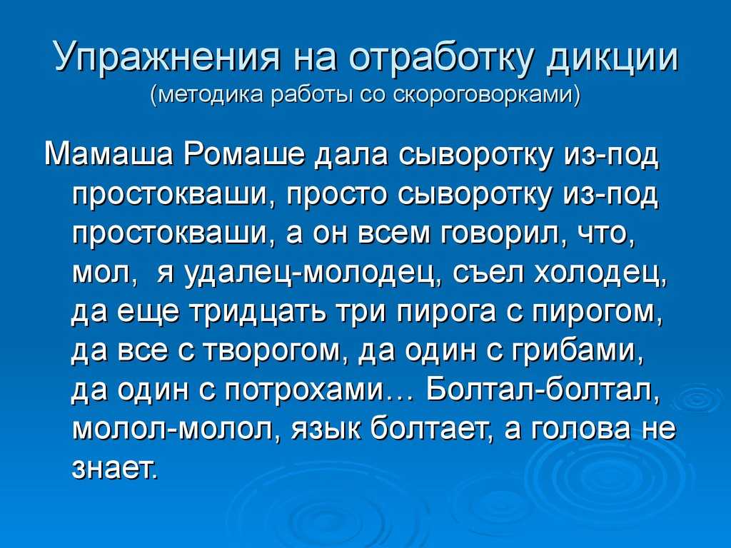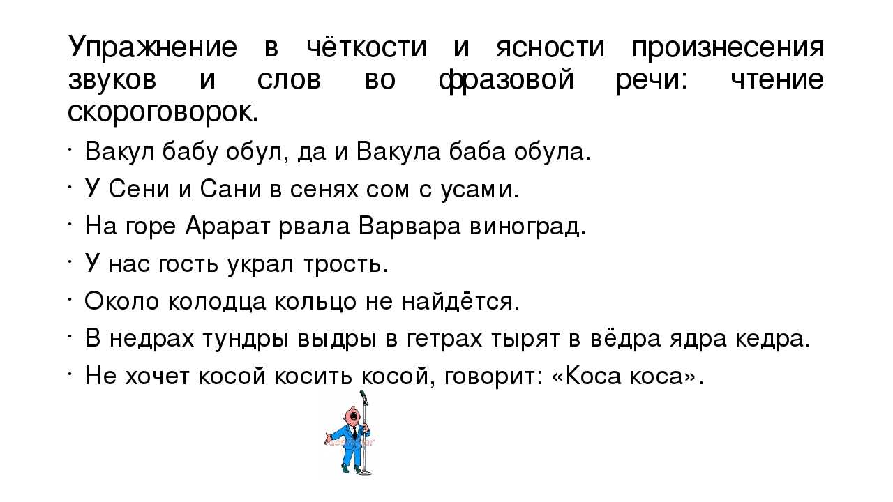 Скороговорки построены на близких по звучанию звуках. Начинать тренировки рекомендуется со скороговорок на трудные для произношения звуки. Чаще всего у взрослых и детей сложности возникают с воспроизведением букв «р», «л», «ш», «с», «м», «н».